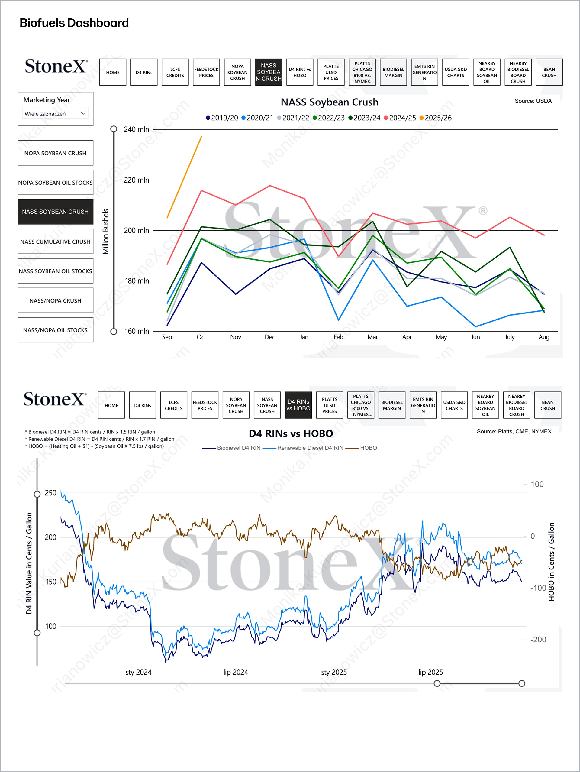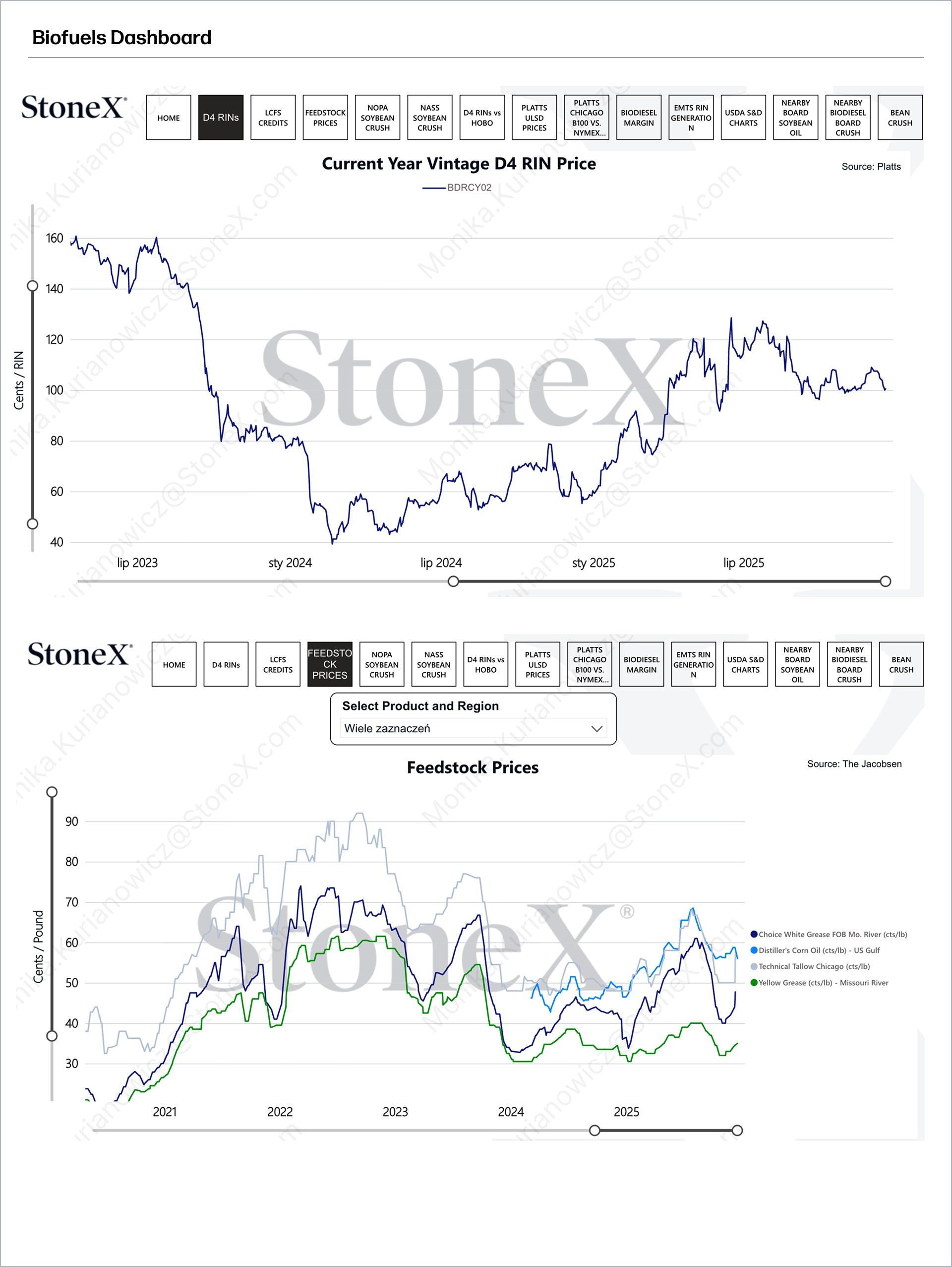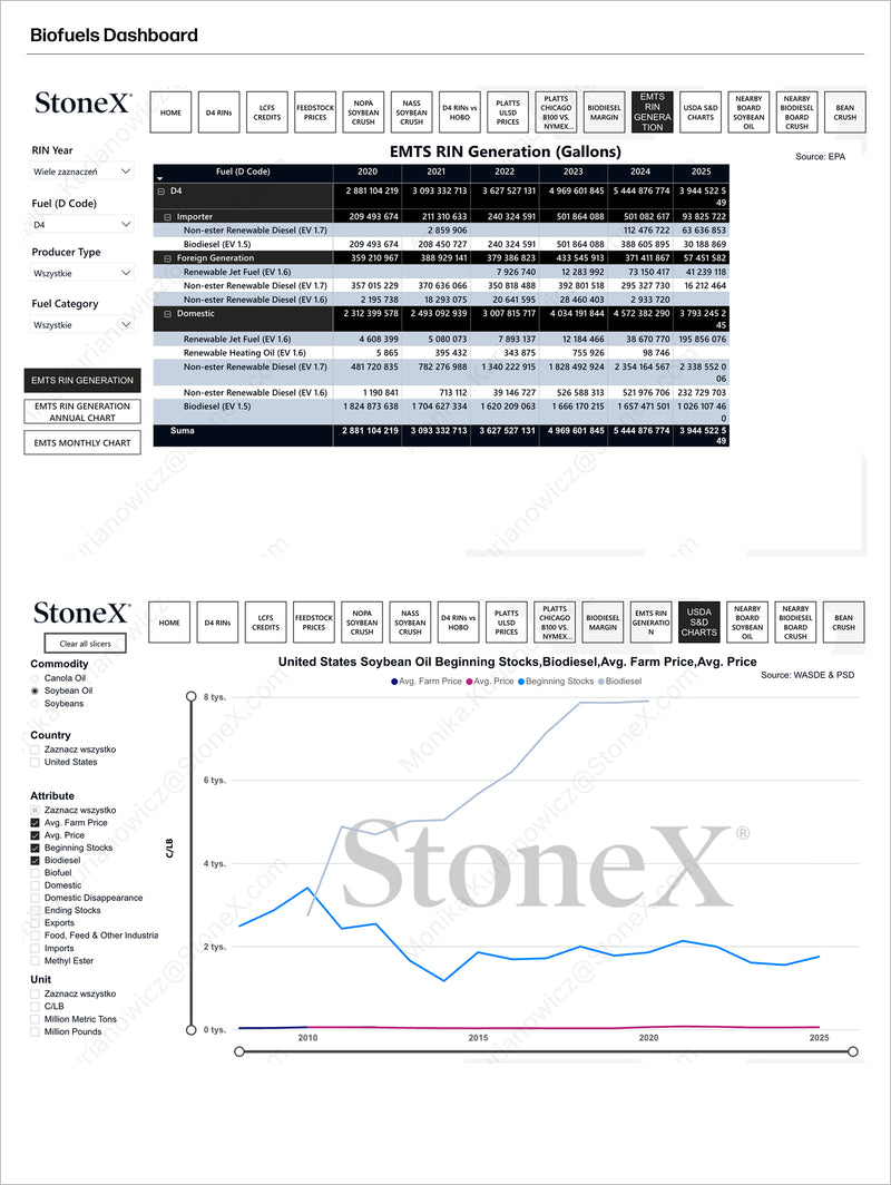 The platform covers a wide range of biofuel and feedstock markets, including biodiesel, renewable diesel, ethanol, sustainable aviation fuel (SAF), soybean oil, canola oil, palm oil, corn oil, used cooking oil (UCO), animal fats and greases (FOG), and broader grains and oilseeds. It also includes import/export data, feedstock consumption dashboards, and monthly soy oil supply‑and‑demand insights.