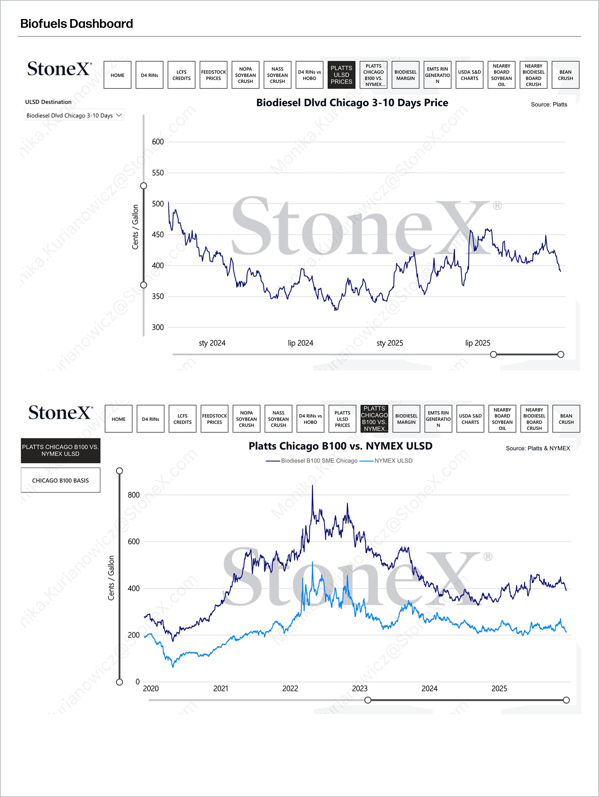 The dashboard is built for traders, analysts, procurement teams, and anyone needing timely visibility into biofuel and feedstock markets. It helps users monitor market volatility, track price movements, compare spreads, analyze supply‑demand trends, and generate custom studies. It’s especially valuable for those focused on soybean oil markets, renewable diesel production, and biomass‑based diesel feedstock flows.