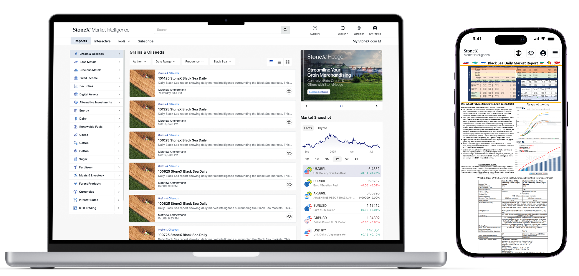 With StoneX, proactively position yourself to capitalize on opportunities and mitigate risks. Our reports provide in-depth analysis and timely insights to help you stay ahead of emerging trends, price fluctuations, and potential disruptions in your market.