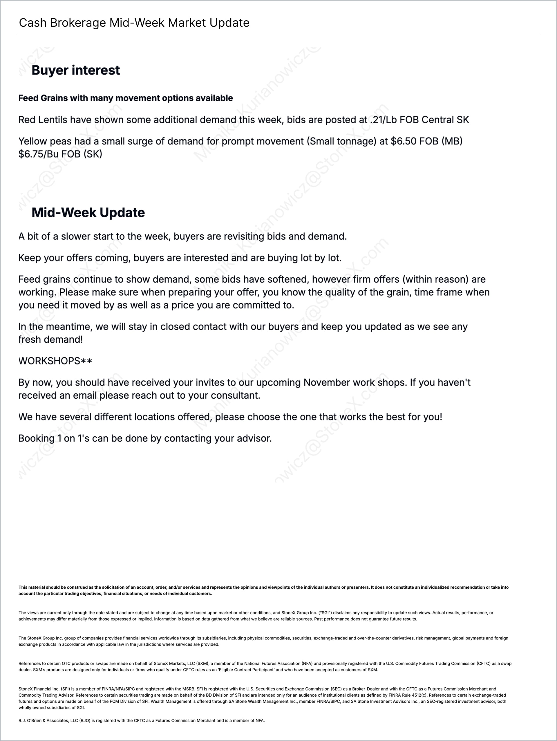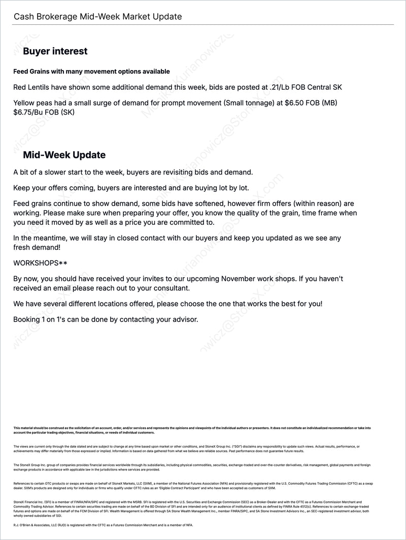 Grains Canada Plan: Focus on Canola and Hard Red Spring Wheat with additional coverage on Durum, Peas, Barley, Oats and Flax Cash plus all the markets covered on the Brokerage Canada Plan.