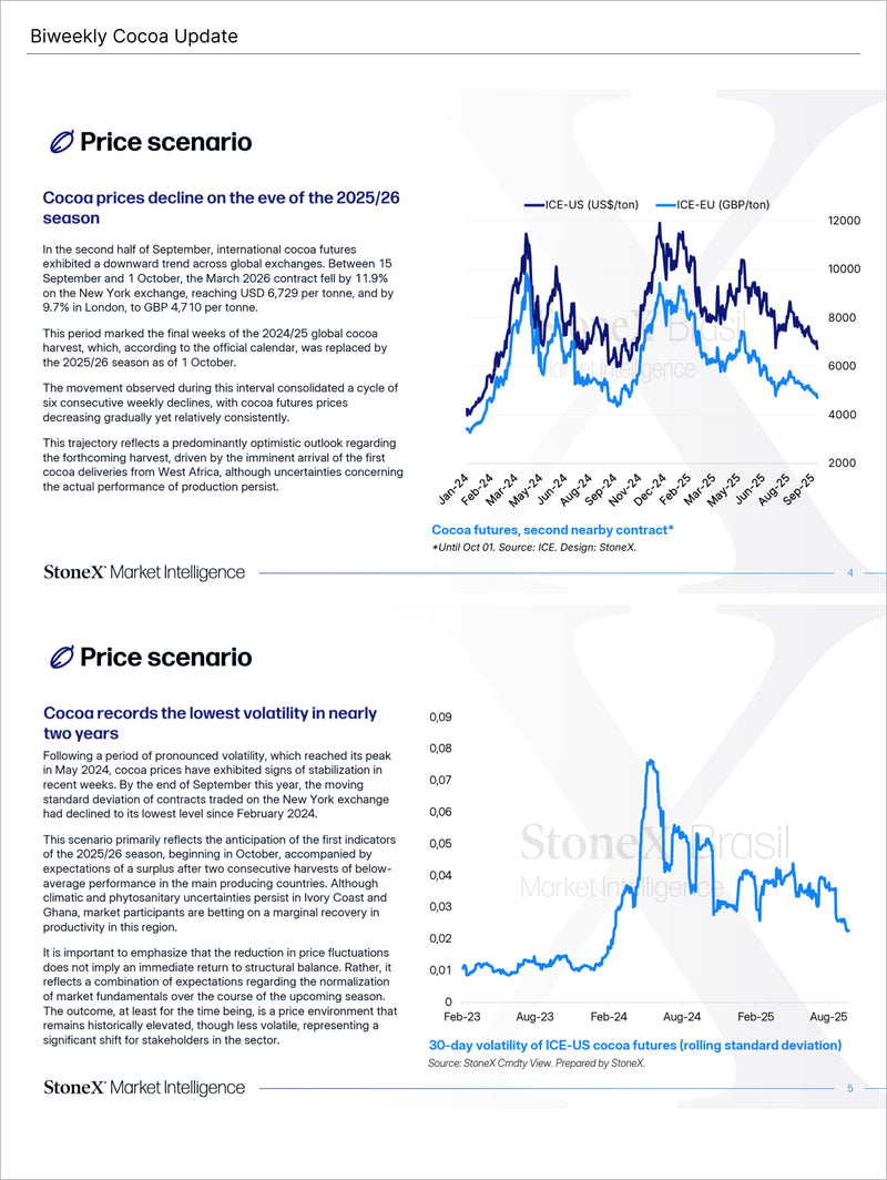 Much more than information, our content brings complete analysis of market movements, their perspectives, and trends. Our reports help rural producers and companies in decision-making, through exclusive analyses, data, and information developed by StoneX Market Intelligence specialists.