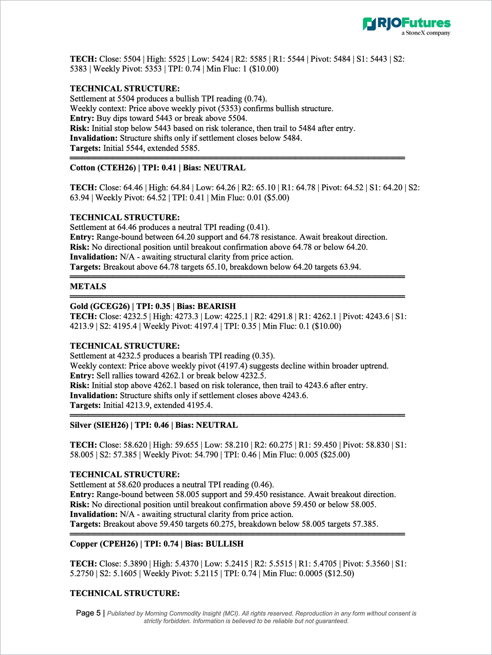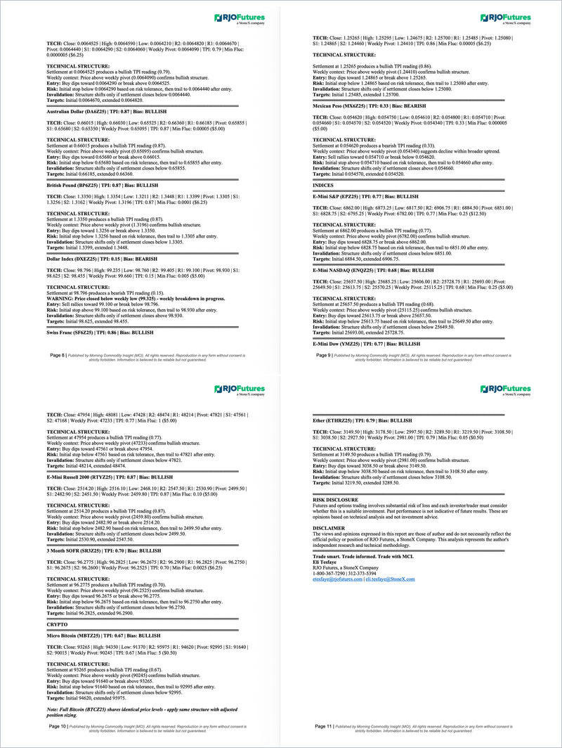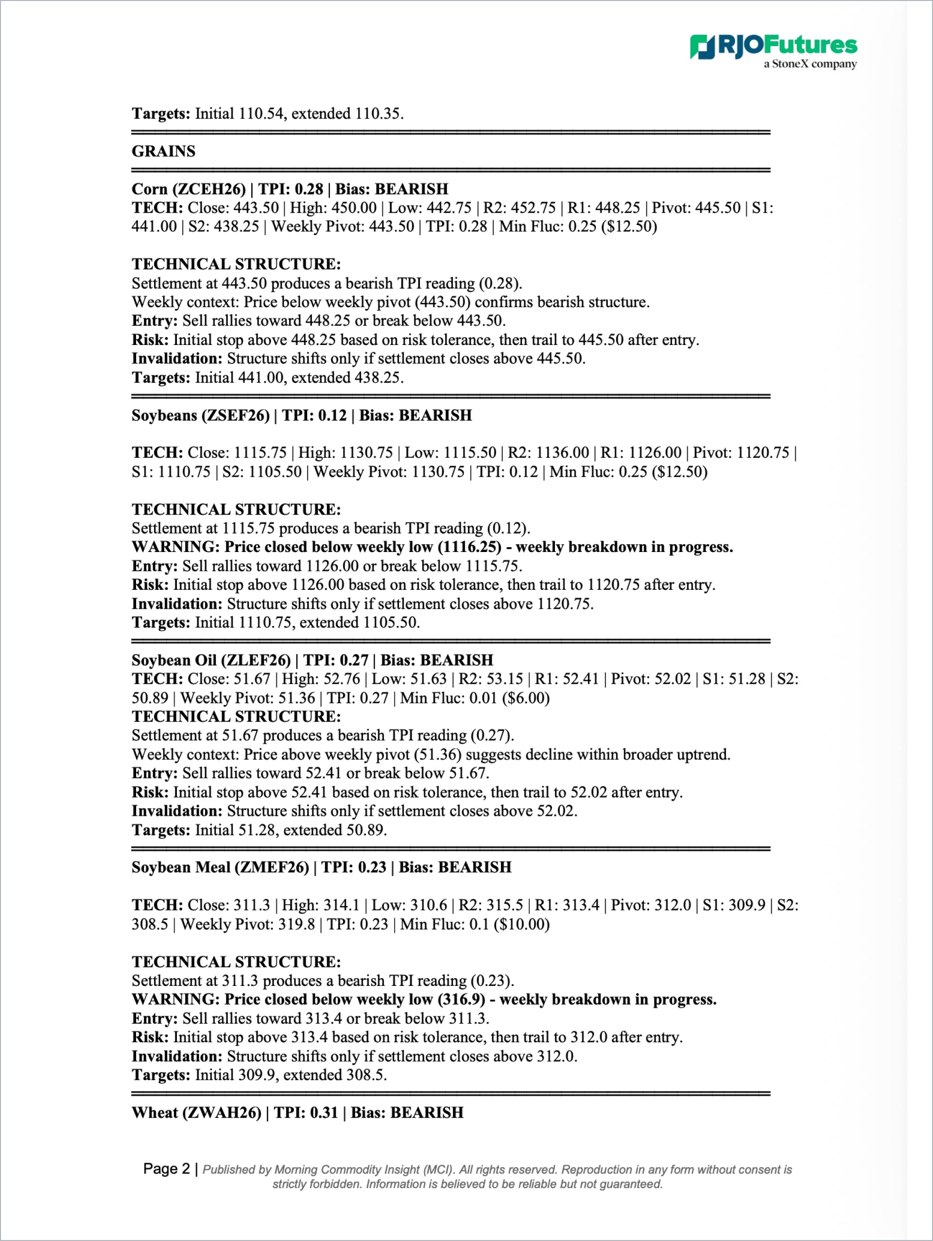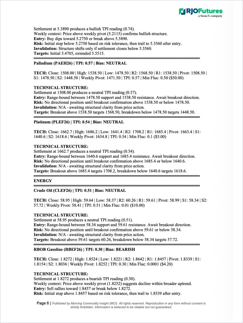 Morning Commodity Insight is a daily futures technical analysis report that provides trend bias, entry zones, stop levels, invalidation points, and targets for 39 major futures markets. It’s designed for traders who want actionable levels before the U.S. session begins.