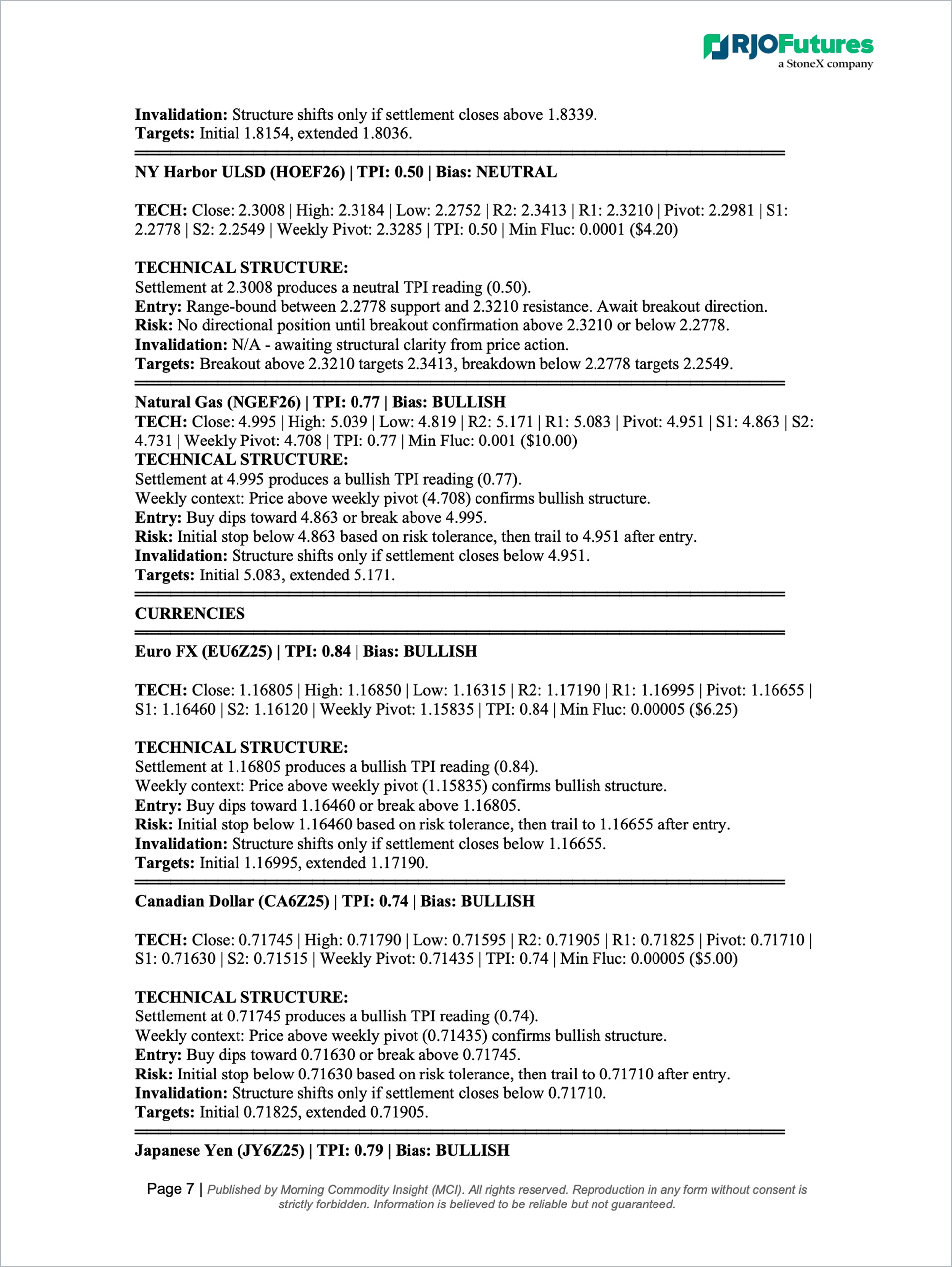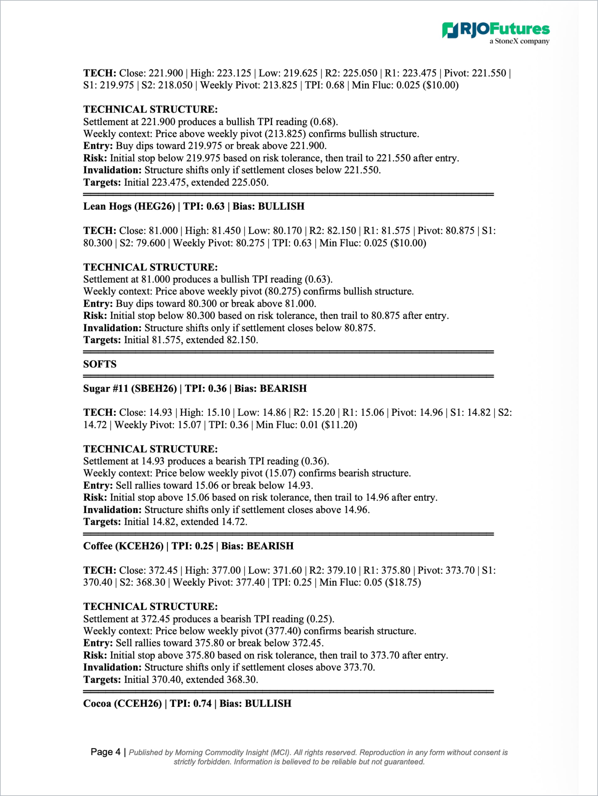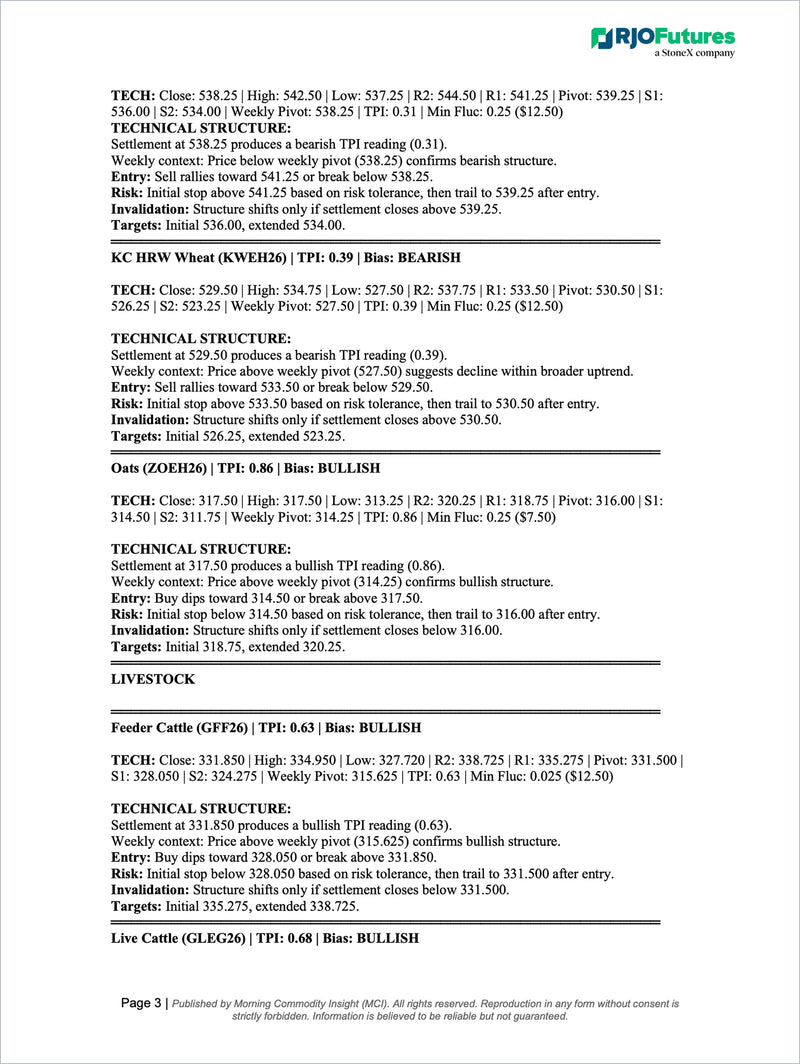 Morning Commodity Insight is a daily futures technical analysis report that provides trend bias, entry zones, stop levels, invalidation points, and targets for 39 major futures markets. It’s designed for traders who want actionable levels before the U.S. session begins.